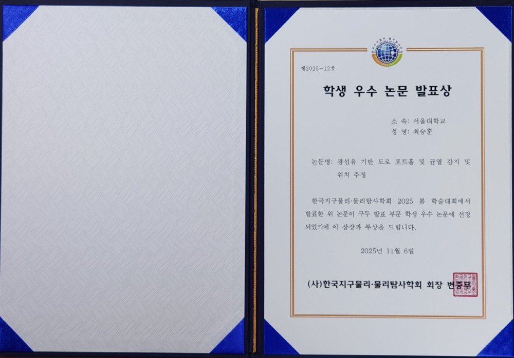 지난 11월 6일 진행된 한국지구물리·물리탐사학회 정기총회에서, 응용지구물리연구실(지도교수 조용채 교수님) 소속 최승훈 연구원은 구두 발표 부문 학생 우수 논문 발표상을 수상하였다. 최승훈 연구원은 “광섬유 기반 도로 포트홀 및 균열 감지 및 위치 추정”이라는 제목으로, 분포형 광섬유 센싱기술을 사용해 차량의 움직임을 모니터링하고 탄성 파동방정식을 사용하여 센서 응답특성을 분석하는 방법론에 대한 연구내용을 발표하였다.
